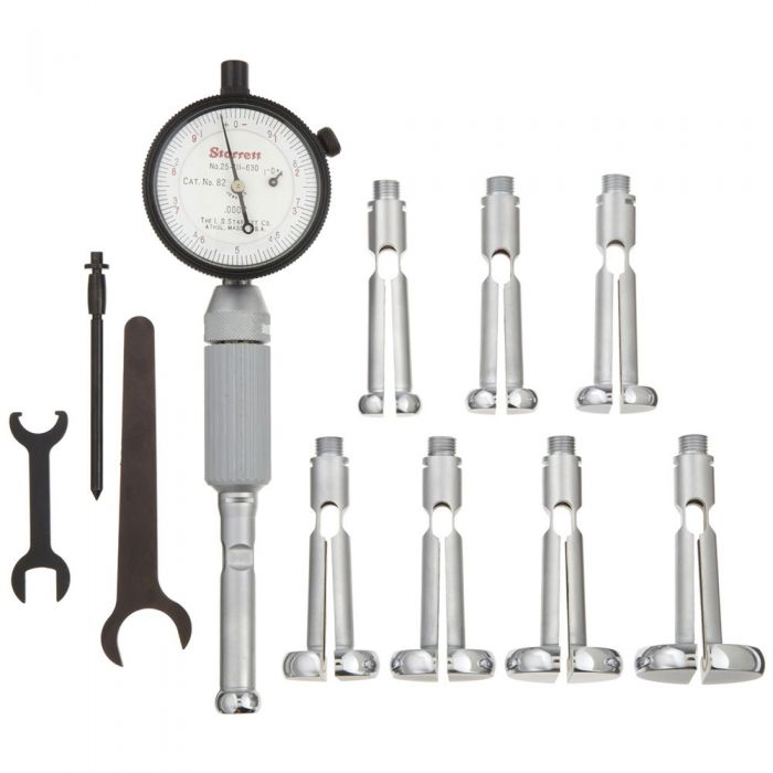 Starrett 82 Dial bore gages are available in convenient sets or with individual probes and dial indicators. Each set consists of a dial indicator, a body and actuating rod, two adjusting wrenches and the probes as specified below. The head may be ordered separately (includes dial indicator, body, and two adjusting wrenches). Individual probes can also be ordered as listed. All probes are furnished with an actuating rod. These gages are also available with electronic indicators by special order. Measurements are taken by comparison so some type of set master should be used as a reference standard. We recommend setting as close to the hole being measured as possible, and this can be easily done with gage blocks or with a micrometer Complete Set, .560-1.565 Range .0001 Grad with Case with a micrometer.